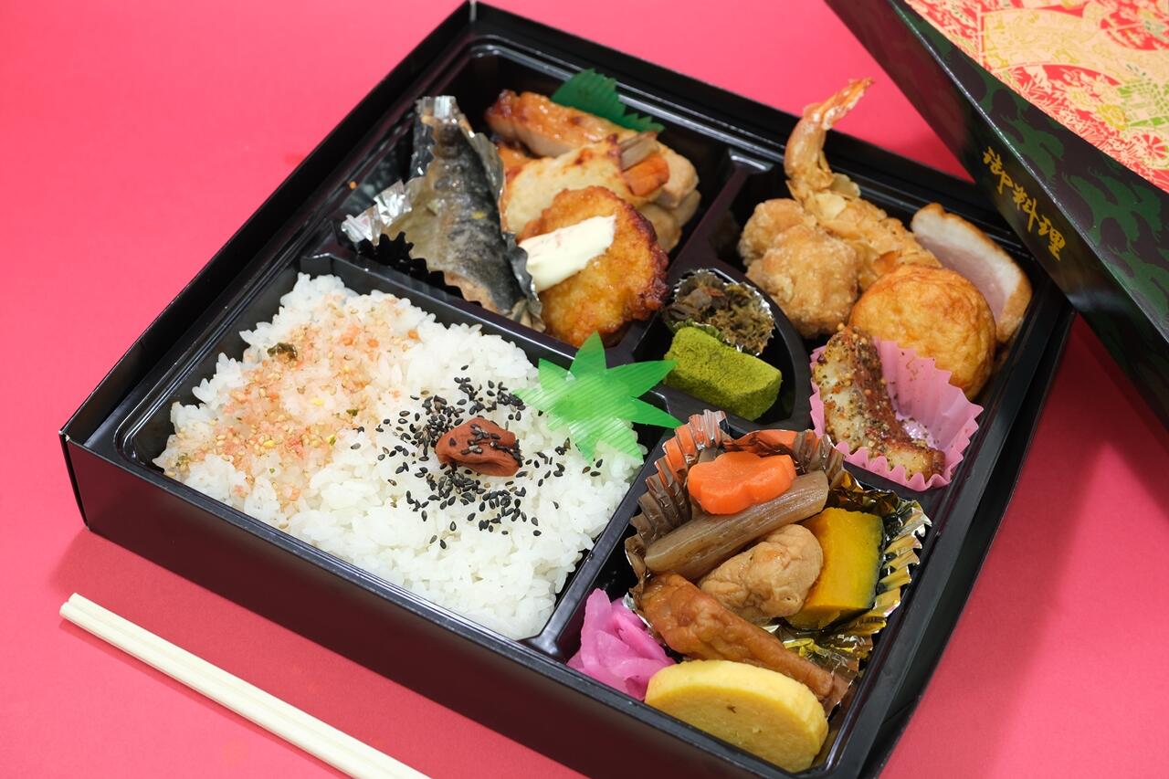 「花」の献立にチキン南蛮焼き・魚の煮付・合鴨甘味を加えた賑やかな安定のお弁当